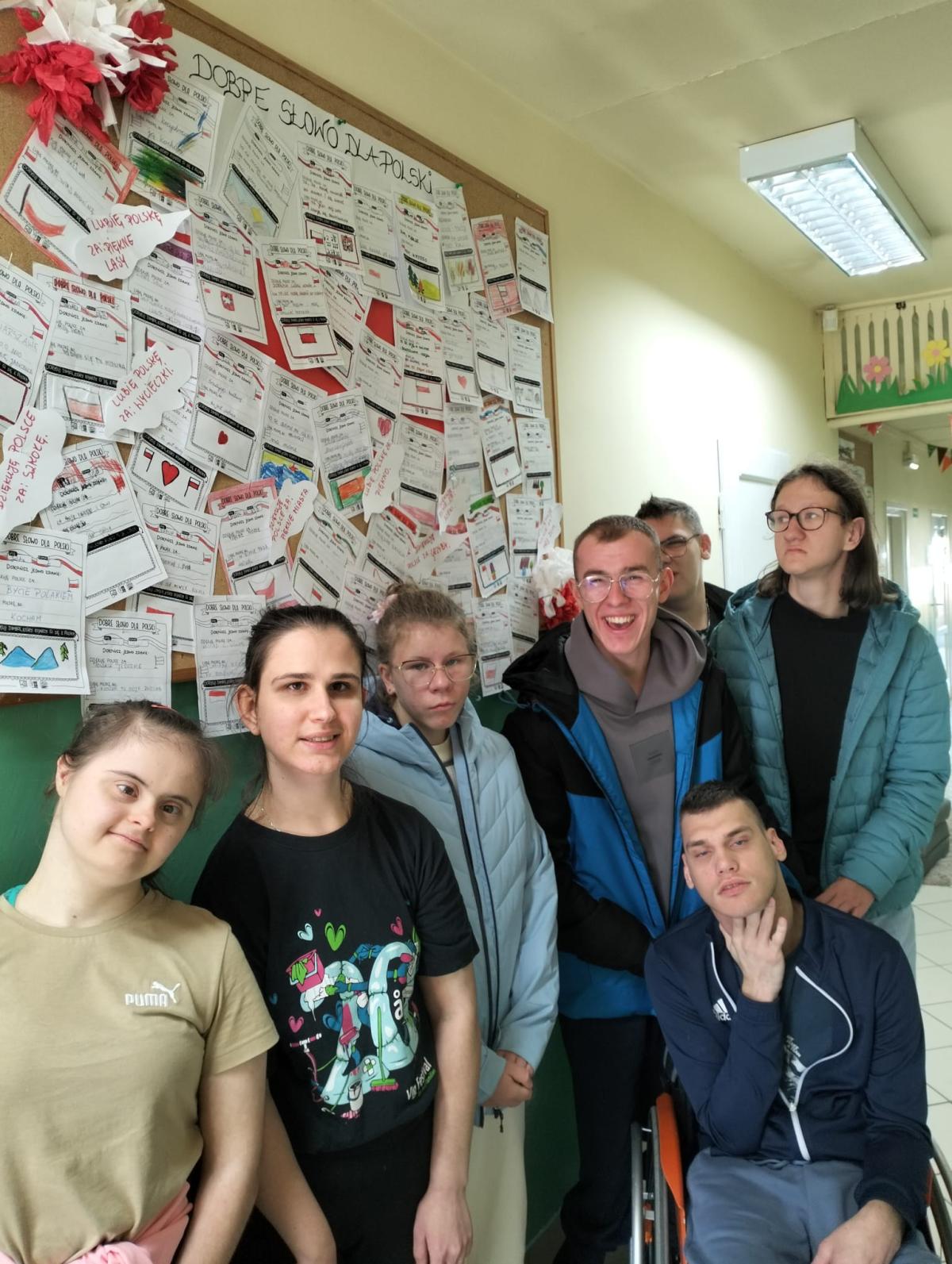 Z okazji Święta Niepodległości uczniowie Szkoły Przysposabiającej do Pracy wzięli udział w szkolnej akcji "Dobre słowo dla Polski". Na kartkach pisali i rysowali za co chcą podziękować i za co lubią swoją ojczyznę. Na korytarzu budynku B powstała "ściana wdzięczności" - gazetka z karteczkami uczniów, tworząca piękną i żywą galerię pozytywnych emocji wobec Ojczyzny.