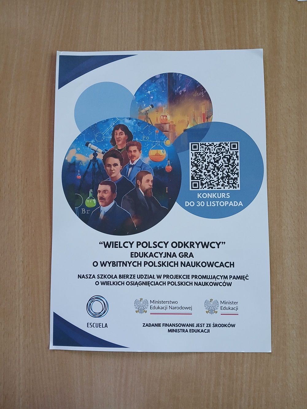 Nasza szkoła bierze udział w projekcie „Odkrywcy 2.0 – nauka matematyki z wykorzystaniem metod grywalizacji oraz planszowa gra edukacyjna na temat wielkich osiągnięć polskich naukowców”, realizowanym przez Fundację Escuela w ramach programu „Odkrywcy”. W ramach projektu otrzymaliśmy egzemplarze gry edukacyjnej „Wielcy Polscy Odkrywcy”. Projekt ma na celu popularyzowanie wiedzy o najwybitniejszych polskich naukowcach, takich jak Maria Skłodowska-Curie, Jan Czochralski czy Ignacy Łukasiewicz, promocję polskiej nauki, innowacji i kreatywności, inspirowanie młodego pokolenia do odkrywania świata w duchu ciekawości, współpracy i szacunku dla osiągnięć wielkich Polaków.