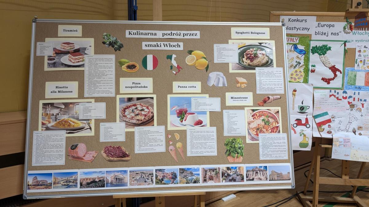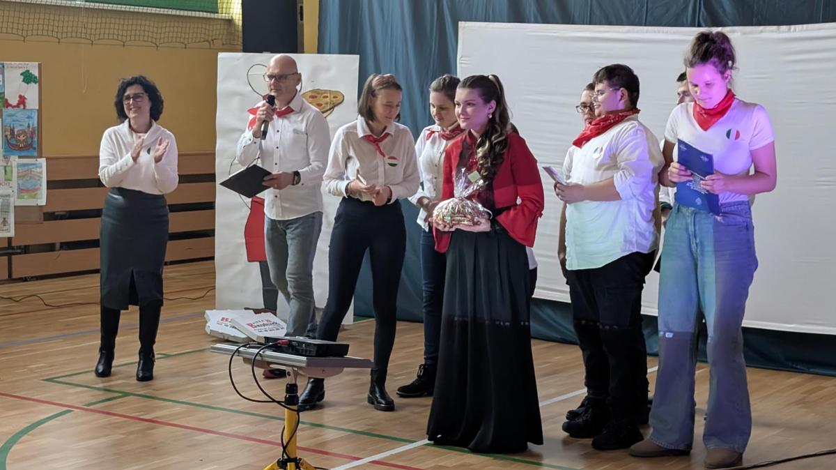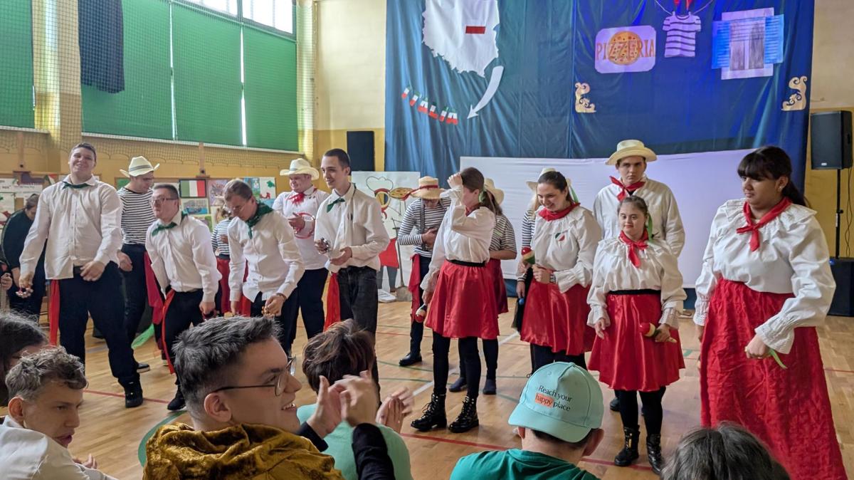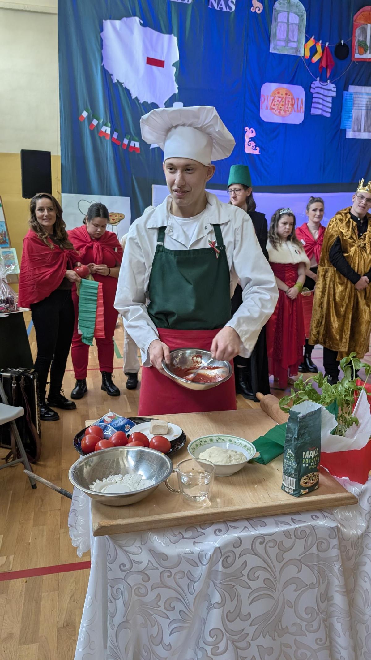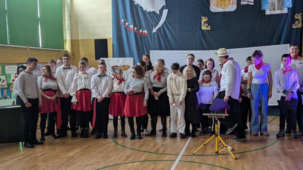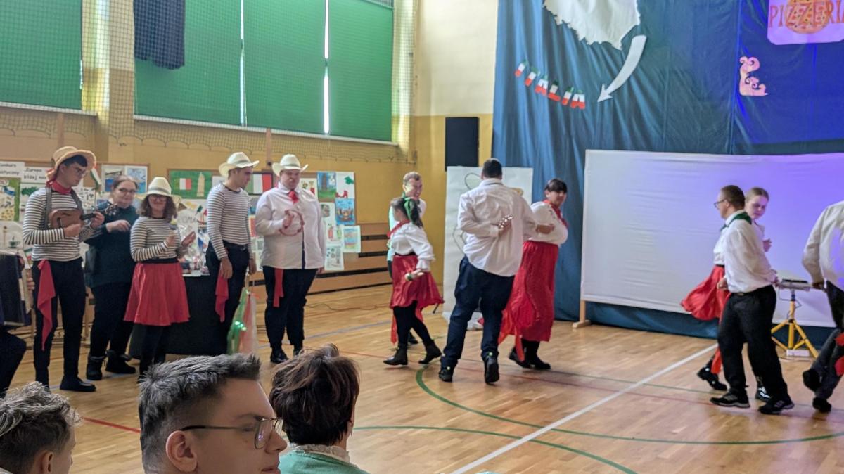 Ważnym elementem spotkania była „Kulinarna podróż przez smaki Włoch” – wystawa fotograficzna włoskich potraw oraz symboliczny poczęstunek, które spotkały się z dużym zainteresowaniem uczestników. Finałem wydarzenia była zabawa w klimacie włoskim, integrująca uczniów i podkreślająca radosny charakter spotkania.