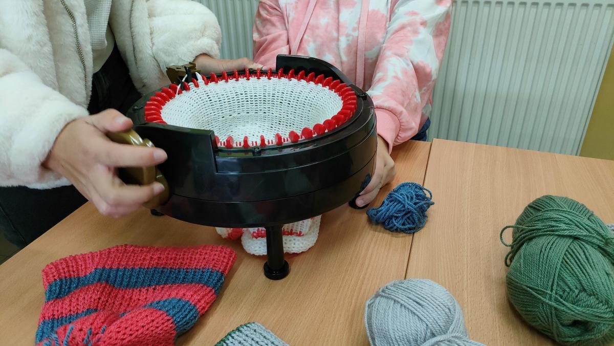 Głowy pełne pomysłów, młynek dziewiarski i kolorowe włóczki sprawiły wiele radości naszym uczniom i zaowocowały wieloma pięknymi projektami. Każdy z uczestników warsztatów uczył się jak własnoręcznie wykonać czapkę. Cieplutkie czapki będą wspaniałą i użyteczną pamiątką po tych wyjątkowych zajęciach.